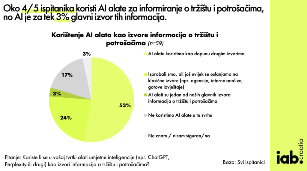 Sve veću ulogu u prikupljanju i obradi podataka imaju AI alati. Oko četiri petine ispitanika koristi umjetnu inteligenciju kao izvor informacija o tržištu i potrošačima.